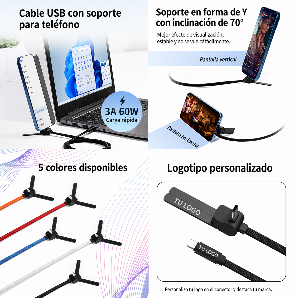 Cable de carga con soporte para teléfono, compuesto por aleación de zinc, aleación de aluminio y trenzado de tela.