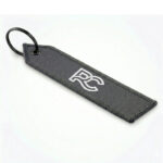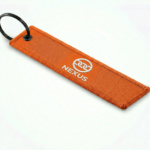 Llavero con un logo bordado a dos colores a ambos lados, el llavero cuenta con unas dimensiones de 120 x 30 mm.