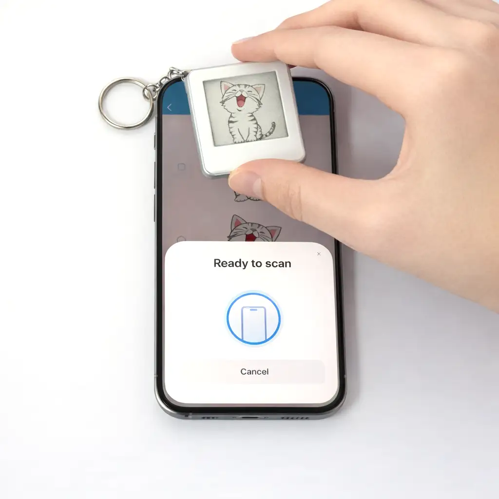 Llavero inteligente en color blanco con pantalla de tinta electrónica de 1,54 pulgadas y tecnología NFC pasiva, compatible con dispositivos Android e iOS, que permite la visualización y gestión de imágenes mediante aplicación móvil.