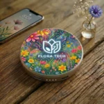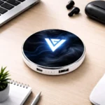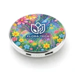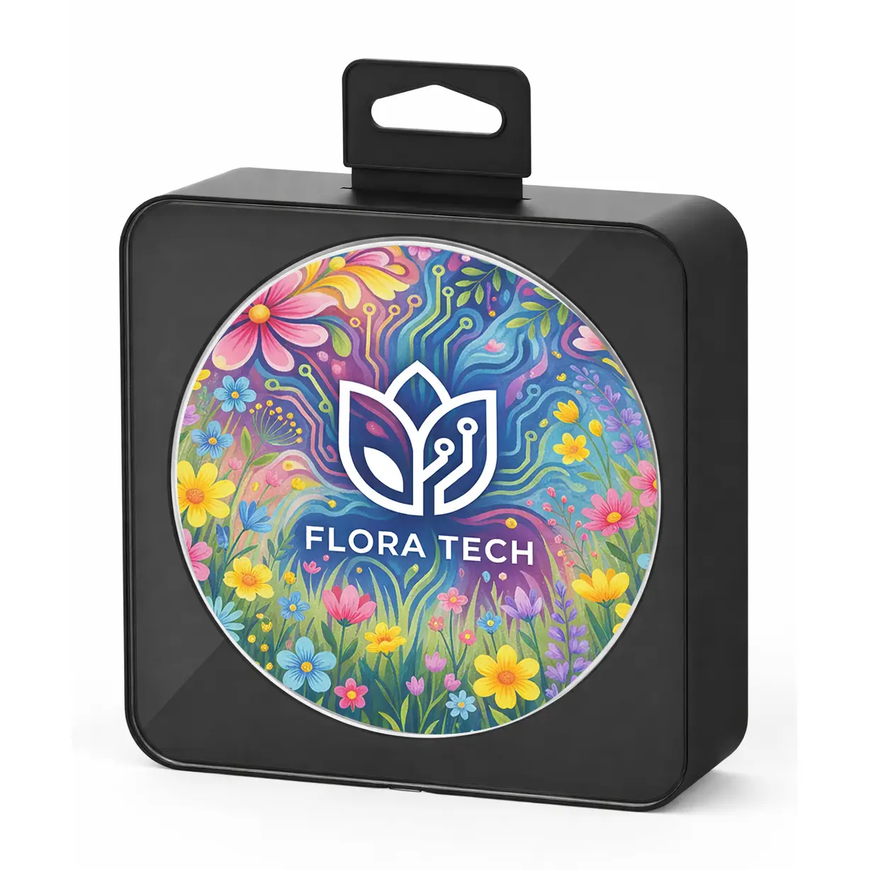 El dispositivo presenta un diseño compacto y elegante, con carcasa fabricada en ABS y PC y una superficie superior de vidrio templado, que aporta un acabado premium y es ideal para personalización mediante impresión a todo color o logotipo iluminado LED. Gracias a su gran área de marcaje, es un producto perfecto para regalos corporativos, campañas promocionales o merchandising tecnológico de alta gama.